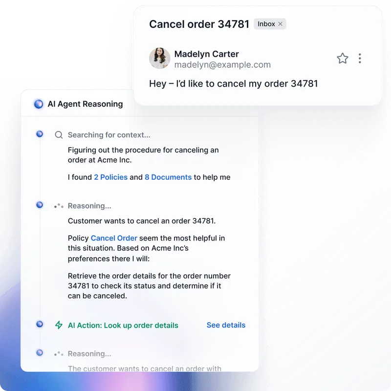 Fully resolves order questions by interpreting live order and carrier data through your specific support policies.