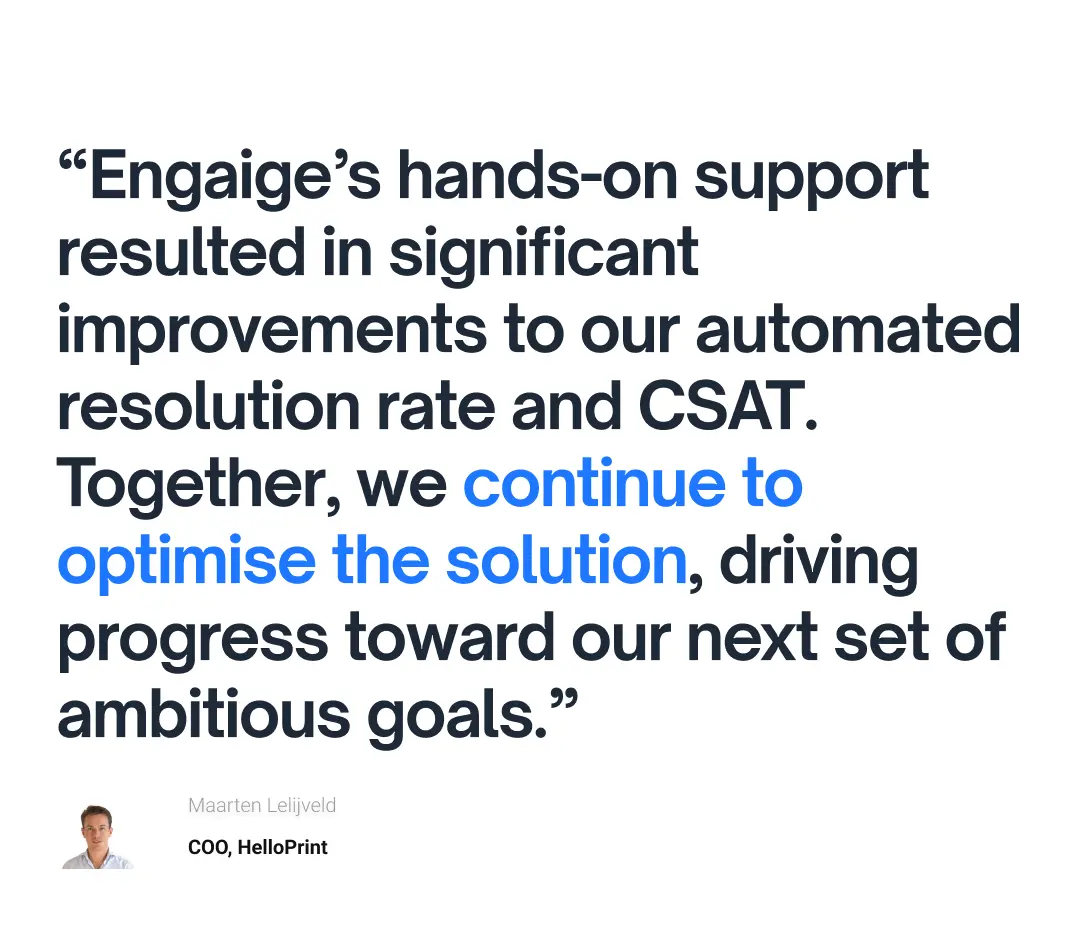 For example, HelloPrint started by implementing Engaige’s AI customer service agents to provide 24/7 support via chatbot. This single change meant HelloPrint was able to drastically reduce time-to-first-response by 90% and gave them the confidence to continue expanding their automation efforts.